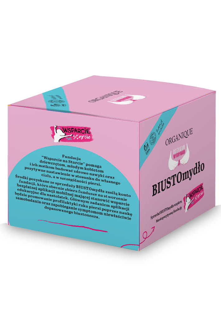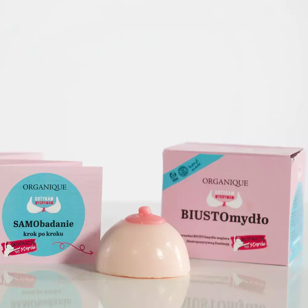 BIUSTOmydło stworzone zostało jako cegiełka 10-tej edycji kampanii Dotykam=Wygrywam przez markę ORGANIQUE, by wspierać kobiety w dbaniu o zdrowie i w pielęgnowaniu miłości do własnego ciała. Teraz wraca, po długim wyczekiwaniu, by znowu pielęgnować kobiece piersi. BIUSTOmydło wymydli się po 30 dniach co przypomni Ci o SAMObadaniu. BIUSTOmydło nie tylko pielęgnuje, ale i edukuje. Zawiera ulotkę będącą instruktażem samobadania.