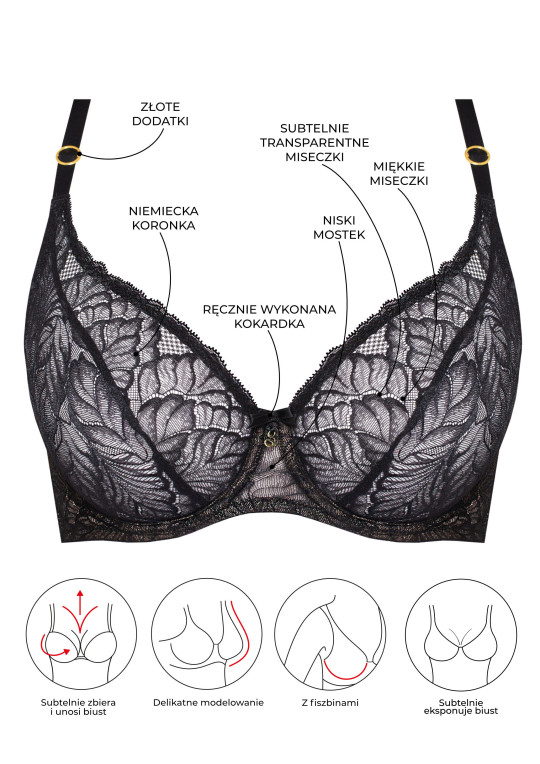 A144 to miękki biustonosz z fiszbinami na średni i drobny. Subtelnie zbiera i unosi piersi. Fason A144 subtelnie eksponuje biust. Krojem nawiązuje do kultowego biustonosza bralette. Miseczki biustonosza wykonane są z koronki.