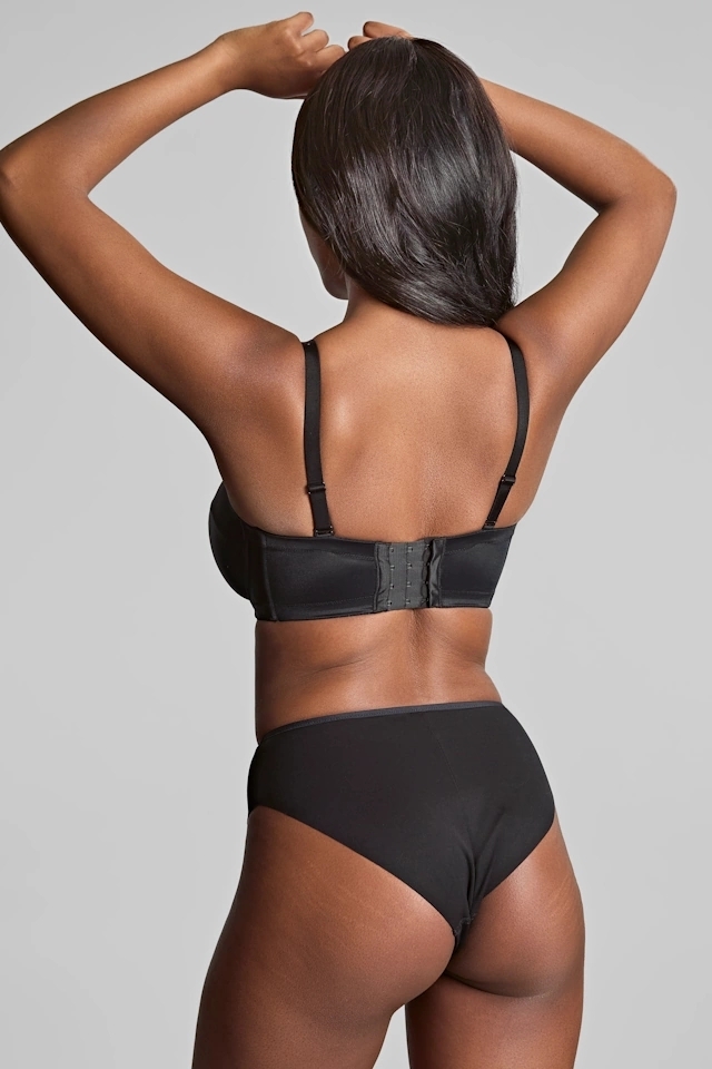 Miseczki usztywnione w całości o dwóch cięciach pionowych i jednym poziomym, oparte na fiszbinie. Szeroki pas obwodu zapinany na 4 rzędy haftek o 3 stopniowej regulacji podszyty silikonem zapewniając optymalne podtrzymanie biustu bez użycia ramiączek. Ramiączka regulowane na całej długości z możliwością odpięcia lub można je także skrzyżować odpowiednio przepinając lub wypiąć jedno, a drugie przepiąć do misek, wtedy ramiączko znajdzie się na szyi.