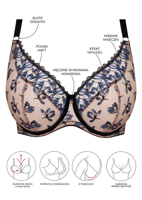 Miękki biustonosz z fiszbinami na średni i duży biust. Subtelnie zbiera i unosi piersi. Fason A125 subtelnie eksponuje piersi. Krojem nawiązuje do kultowego biustonosza bralette.