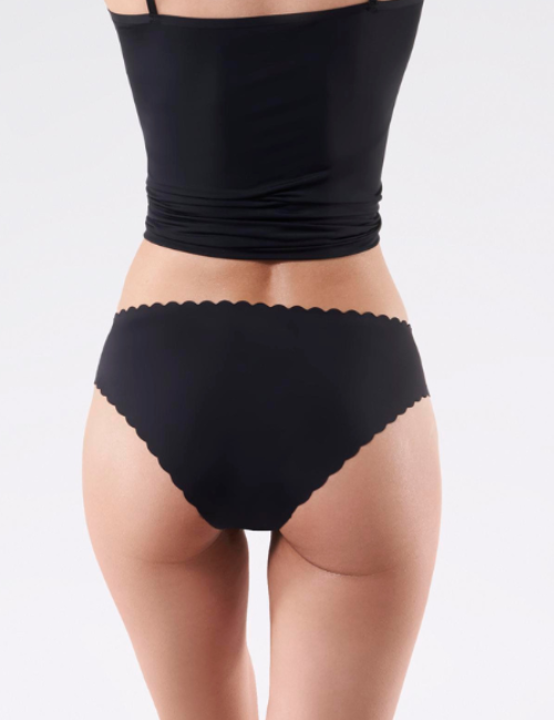 Czarne figi damskie o klasycznym, wygodnym kroju. Model wyróżnia się dzięki ozdobnym krawędziom, wykończonym muszelkową falbanką. Przy nogawkach i na górze zastosowano nowoczesną technologię laserowych cięć JULIMEX Laser-cut®, dzięki czemu te wyjątkowo kobiece figi nie będą odznaczać się nawet pod obcisłymi strojami. W kroku wszyto higieniczną wkładkę z bawełny.